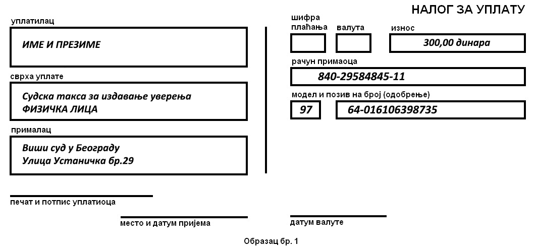 - доказ о уплати таксе за издавање података из казнене евиденције, у износу од 300,00 динара уплатити на број рачуна 840-29584845-11, модел 97 и позив на број 64-016106398735 (у прилогу обавештења можете погледати примерак уплатнице).