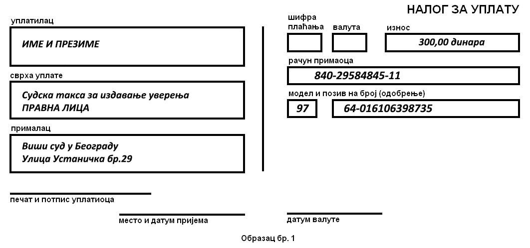 - Доказ о уплати таксе за издавање уверења у износу од 300,00 динара уплатити на број рачуна 840-29584845-11 модел 97 и позив на број 64-016106398735