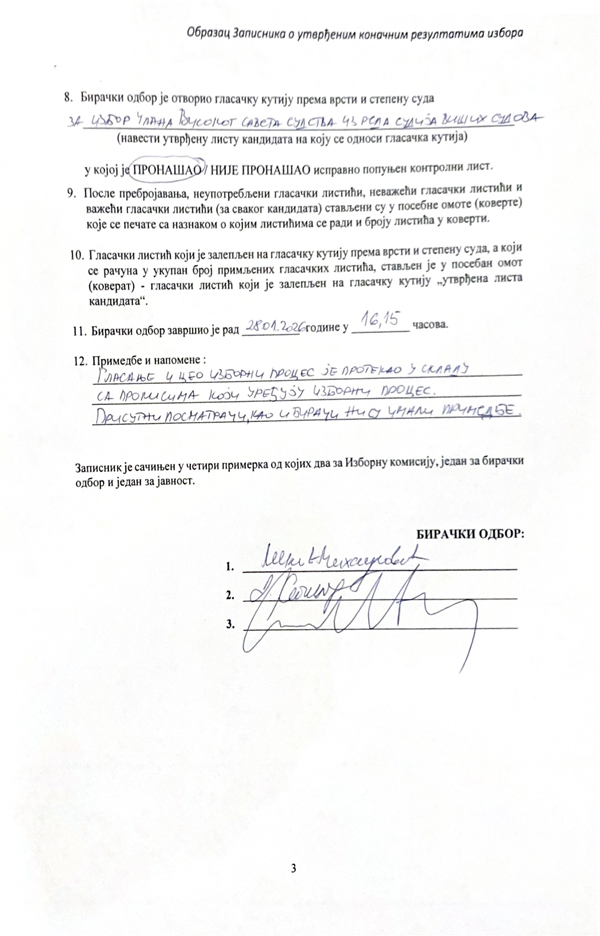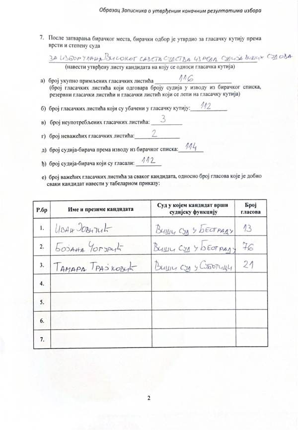 ЗАПИСНИК О УТВРЂЕНИМ КОНАЧНИМ РЕЗУЛТАТИМА ИЗБОРА ВИШЕГ СУДА У БЕОГРАДУ