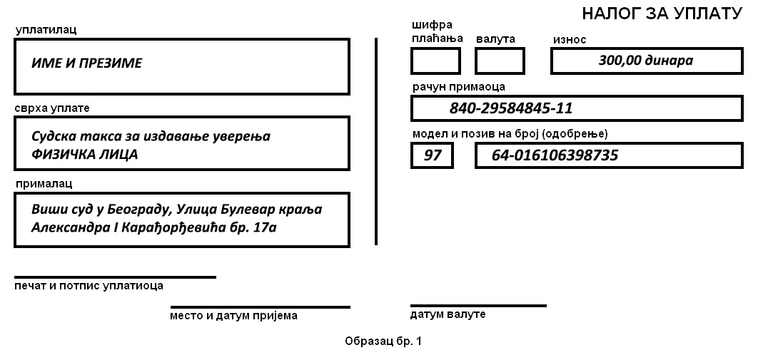 - доказ о уплати таксе за издавање података из казнене евиденције, у износу од 300,00 динара уплатити на број рачуна 840-29584845-11, модел 97 и позив на број 64-016106398735 (у прилогу обавештења можете погледати примерак уплатнице).