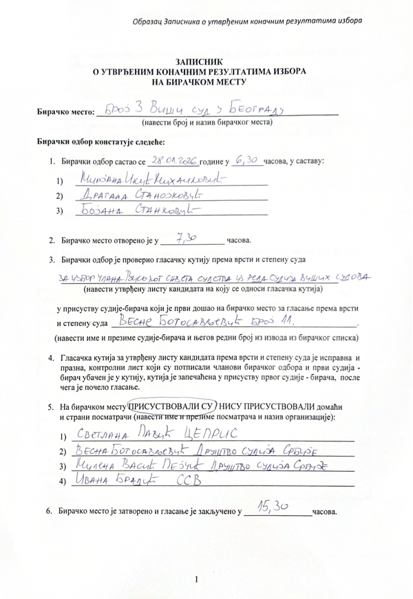 ЗАПИСНИК О УТВРЂЕНИМ КОНАЧНИМ РЕЗУЛТАТИМА ИЗБОРА ВИШЕГ СУДА У БЕОГРАДУ